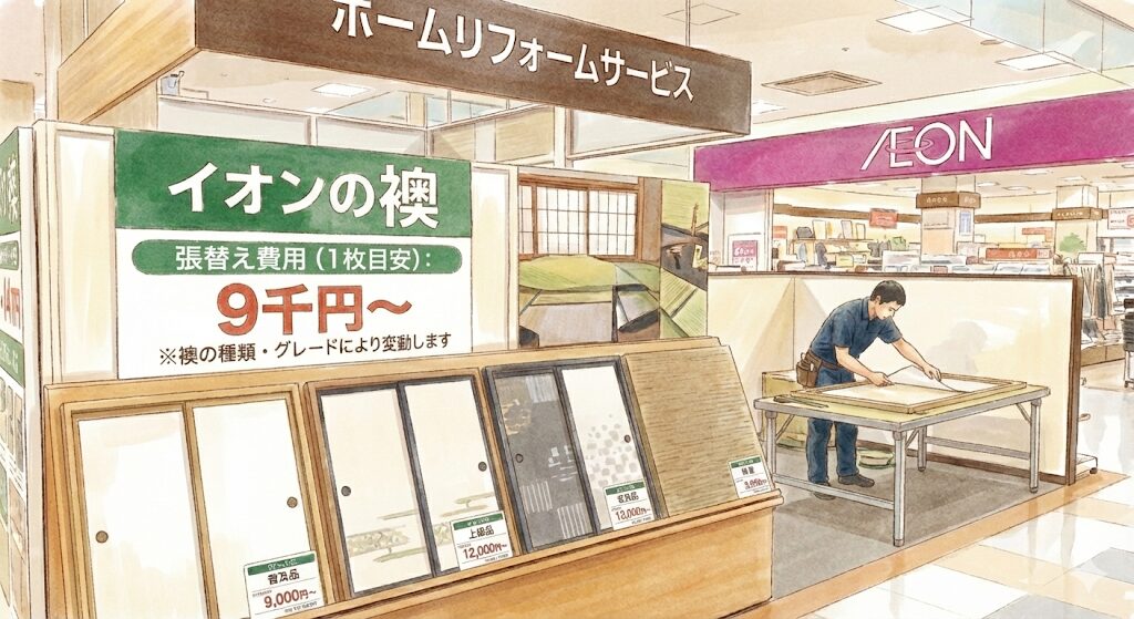 イオンに襖の張り替えを依頼した場合にかかる費用は、9千円〜が目安です。