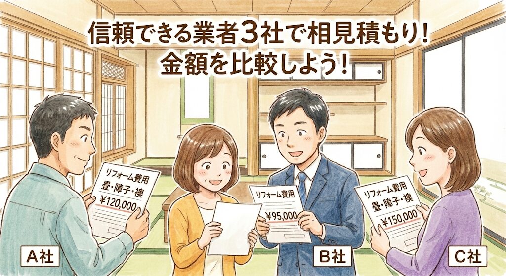 畳・障子・襖のリフォームにかかる費用は、業者によって大きく異なります。信頼できる業者を3社ほど探して、相見積もりで金額を比較してみましょう。