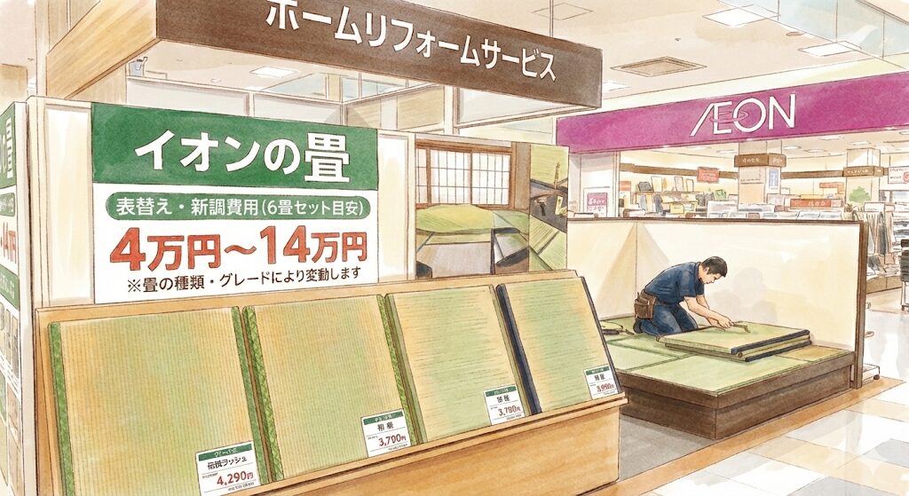 イオンに畳の表替えを依頼する場合にかかる費用は、6畳セットで4〜14万円が目安です。ただし、畳の種類(素材)やグレードによって金額が変動する点に注意しましょう。