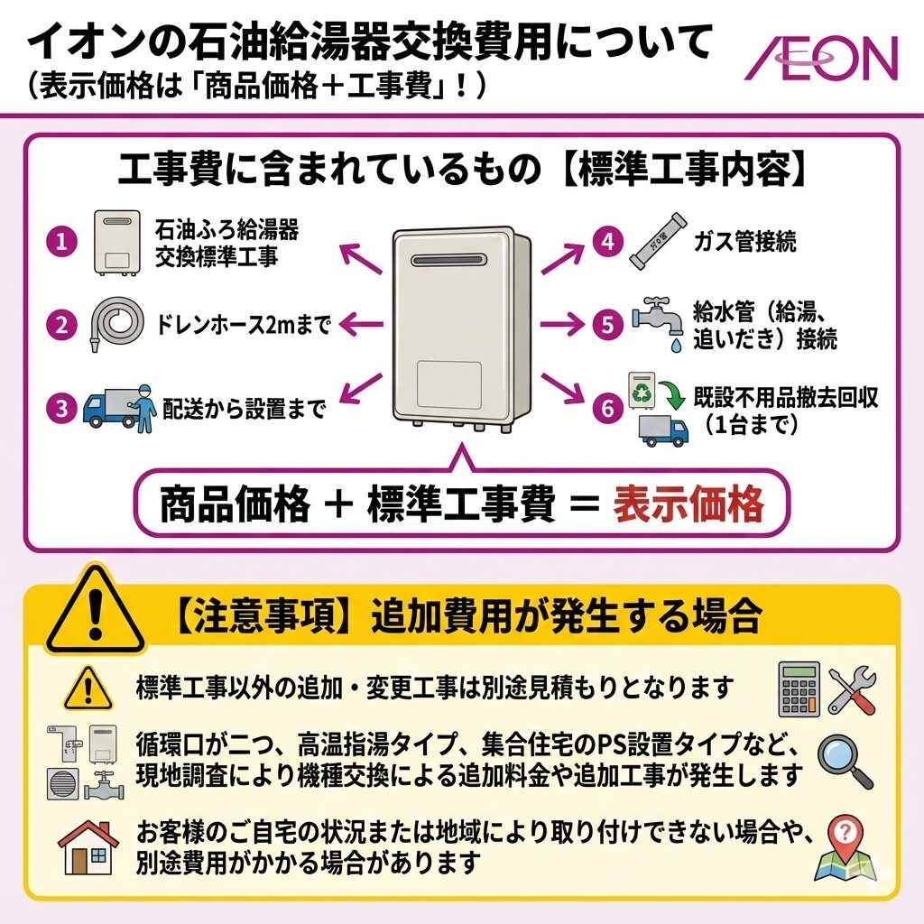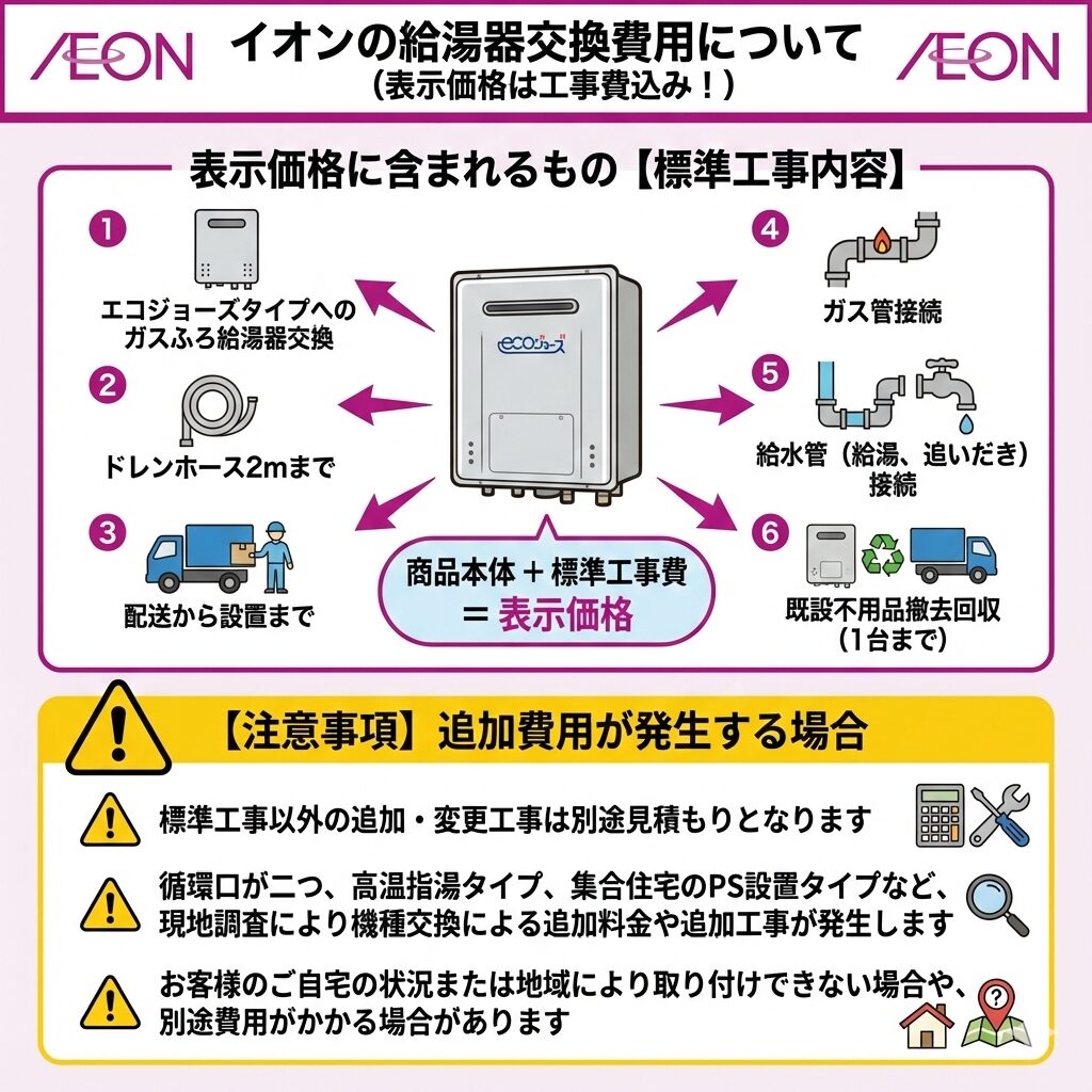 イオンの給湯器交換にかかる費用は、表示価格に工事費用(交換費用)が含まれています。表示価格に含まれているのは、商品本体と以下の内容です。