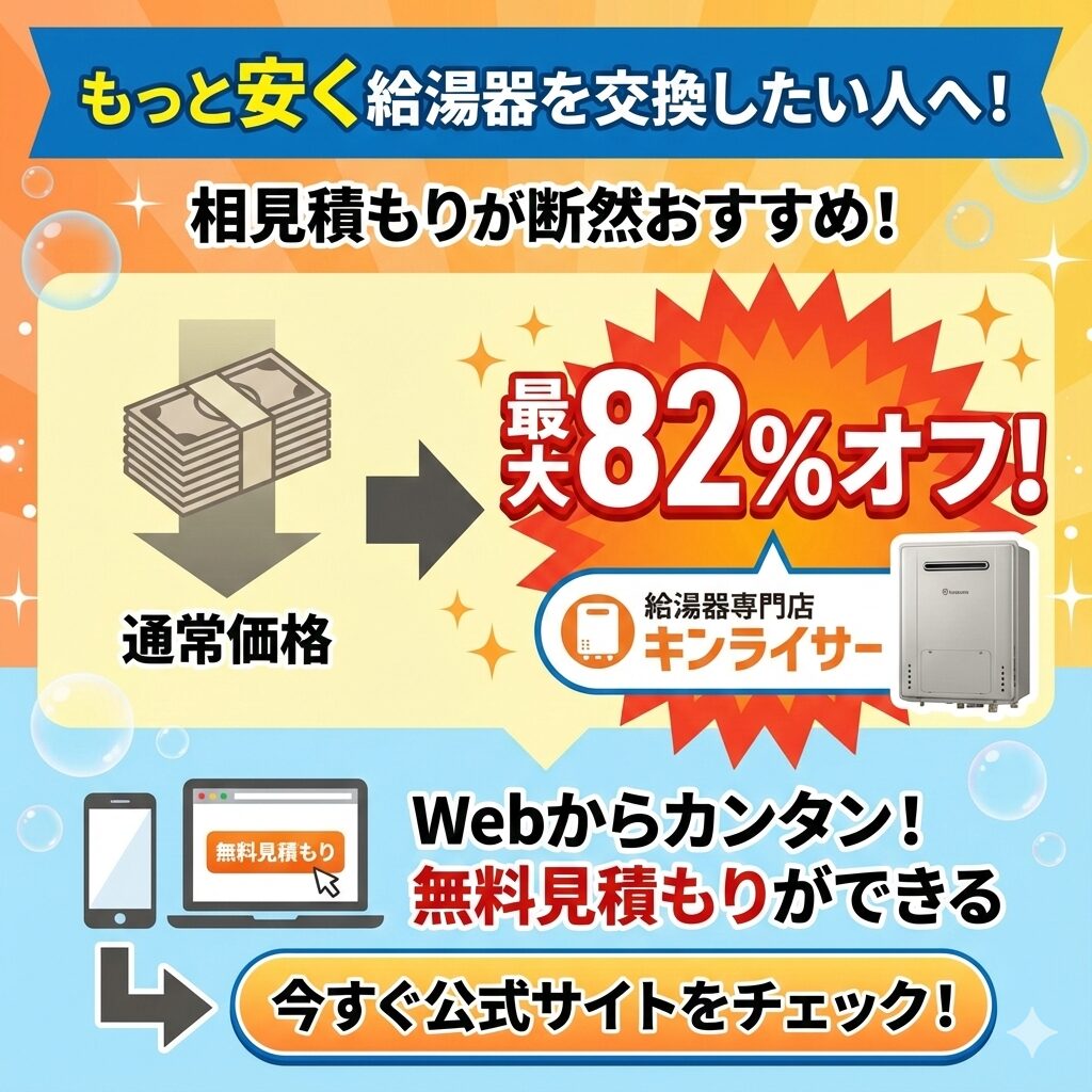 クロノもっと安く給湯器を交換したいという人は、相見積もりするのがおすすめです!例えば、給湯器専門店のキンライサー