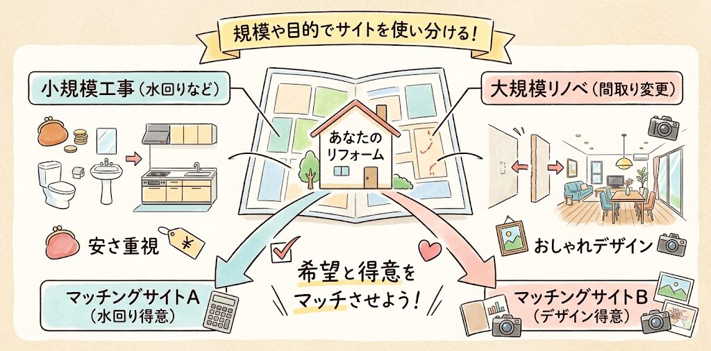 リフォームの規模や目的によって、得意とするサイトは異なります。
