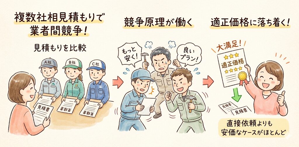 しかし、サイト上では複数社での相見積もりが前提となるため、業者間に競争原理が働き、結果的に直接依頼するよりも適正価格(または安価)に落ち着くケースがほとんどです。
