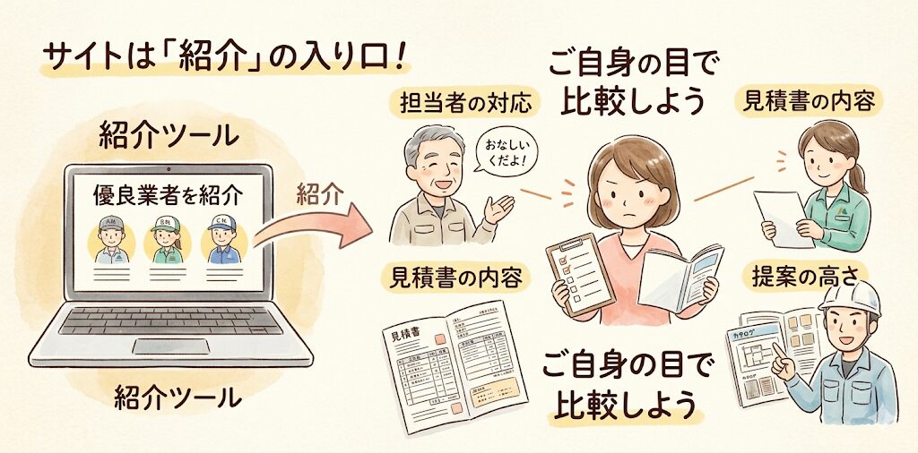 サイトはあくまで優良な業者を「紹介」してくれるツールに過ぎません。実際に現場調査に来た担当者の対応、見積もり書に記載されている項目の詳細さ、提案力の高さなどは、ご自身の目で比較検討する必要があります。