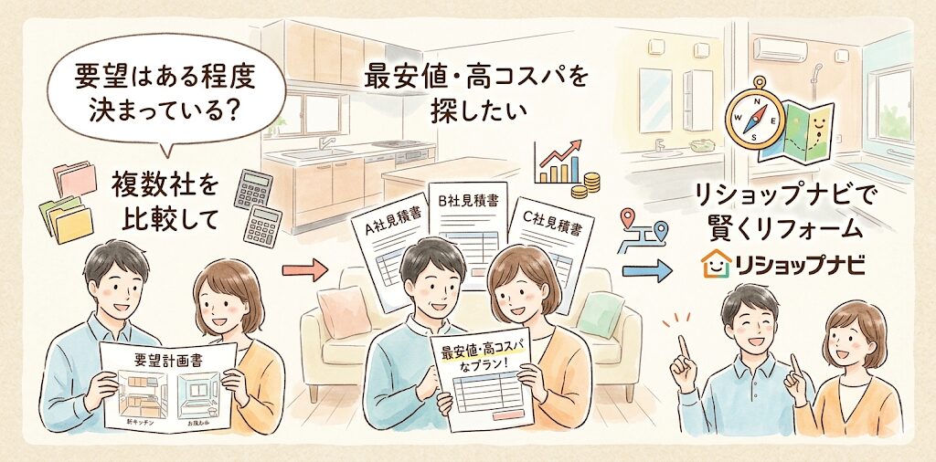 すでにある程度リフォームの要望が決まっており、複数社から見積もりを集めて「最安値」や「コストパフォーマンスの高いプラン」を探したい方には「リショップナビ」が適しています。