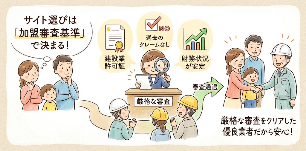 サイト選びで最も重要なのが、リフォーム会社の「加盟審査基準」です。悪徳業者を排除するため、サイト側が事前に業者の信頼性をチェックしているかどうかがカギとなります。