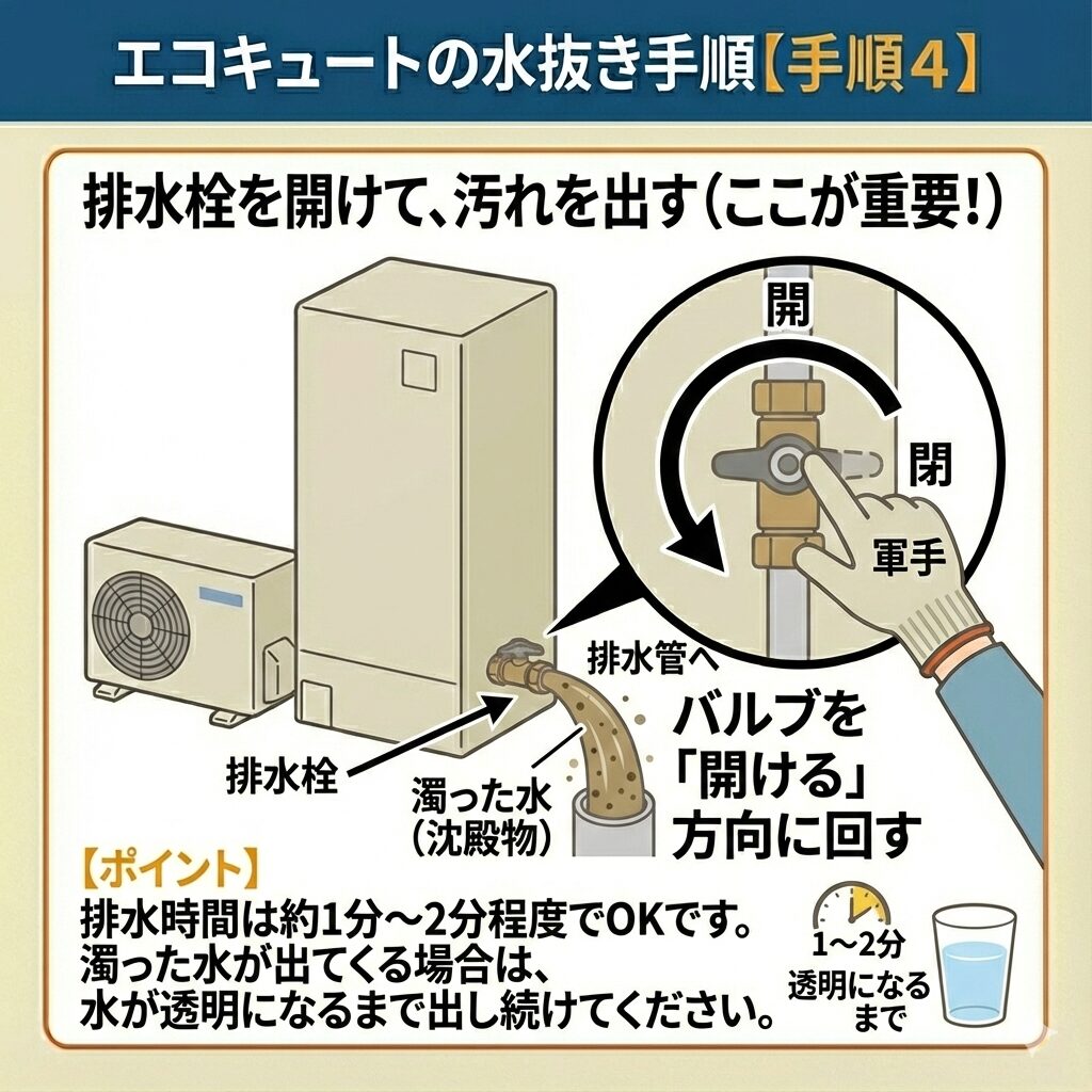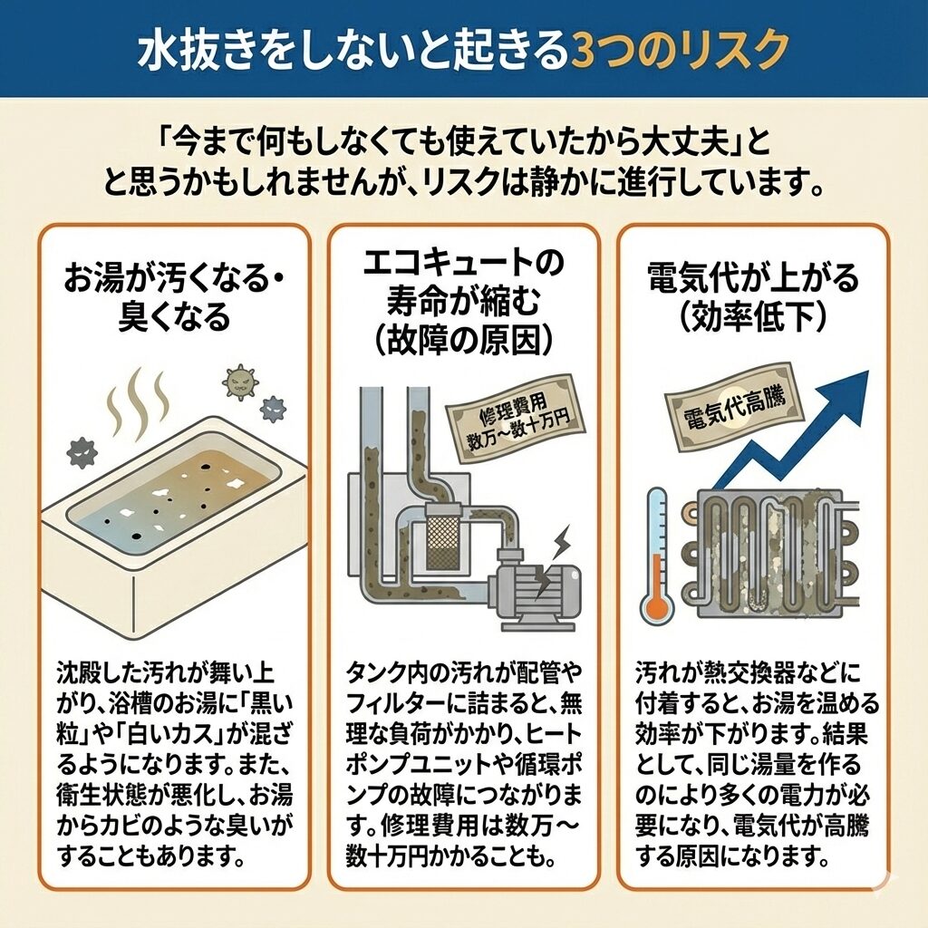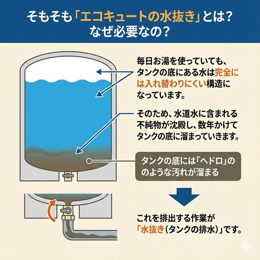 「エコキュートを設置して数年、一度も水抜き(タンクのメンテナンス)をしたことがない……」 「最近、お湯に白いカスが混ざっている気がする……」