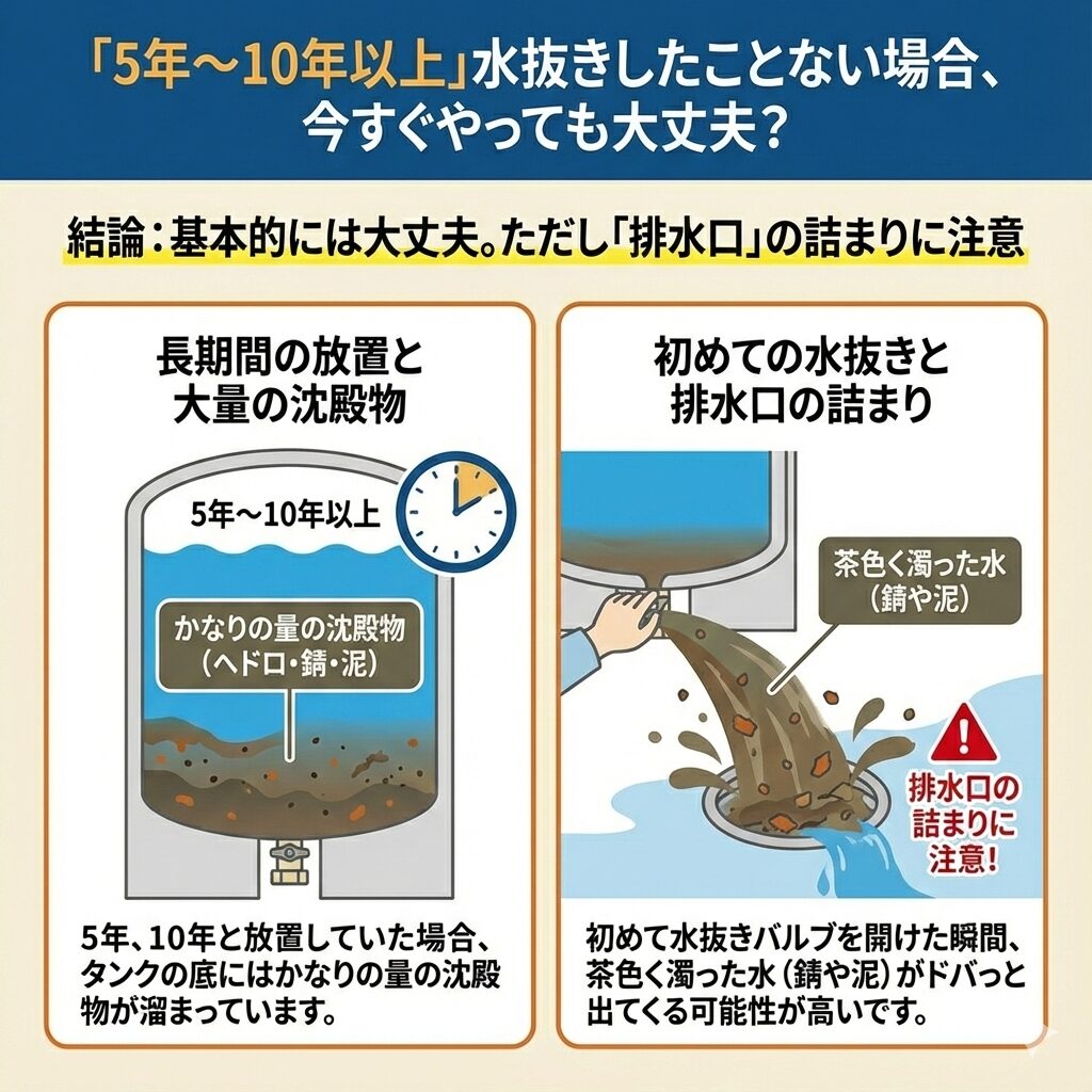 5年、10年と放置していた場合、タンクの底にはかなりの量の沈殿物が溜まっています。初めて水抜きバルブを開けた瞬間、茶色く濁った水(錆や泥)がドバっと出てくる可能性が高いです。