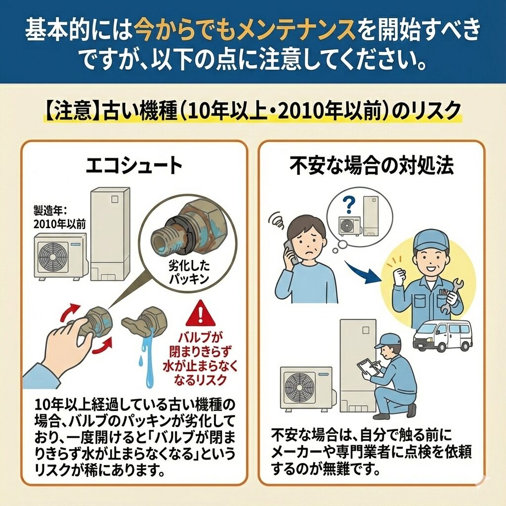 10年以上経過している古い機種(特に2010年以前のもの)の場合、バルブのパッキンが劣化しており、一度開けると「バルブが閉まりきらず水が止まらなくなる」というリスクが稀にあります。 不安な場合は、自分で触る前にメーカーや専門業者に点検を依頼するのが無難です。