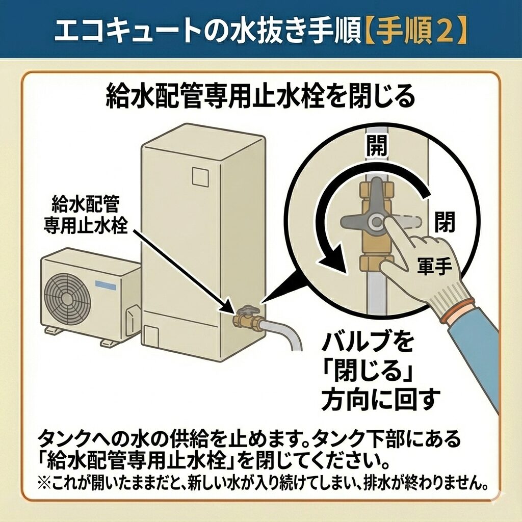 タンクへの水の供給を止めます。タンク下部にある「給水配管専用止水栓」を閉じてください。 ※これが開いたままだと、新しい水が入り続けてしまい、排水が終わりません。