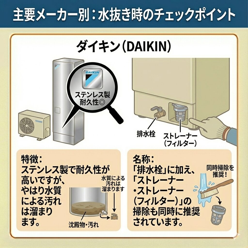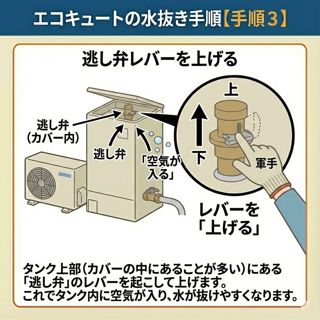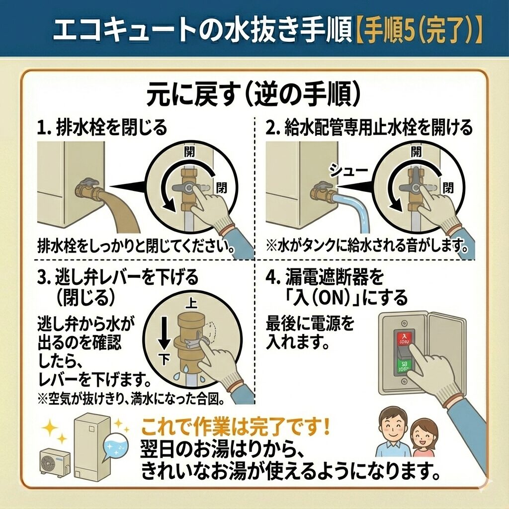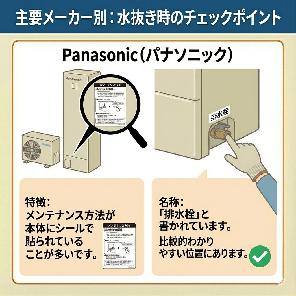 ここでは、一般的なエコキュートの水抜き手順を解説します。 ※メーカー(パナソニック、三菱、ダイキン、日立など)によって細かな名称は異なりますが、基本構造は同じです。