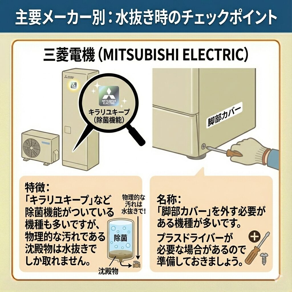 - 特徴: 「キラリユキープ」など除菌機能がついている機種も多いですが、物理的な汚れである沈殿物は水抜きでしか取れません。