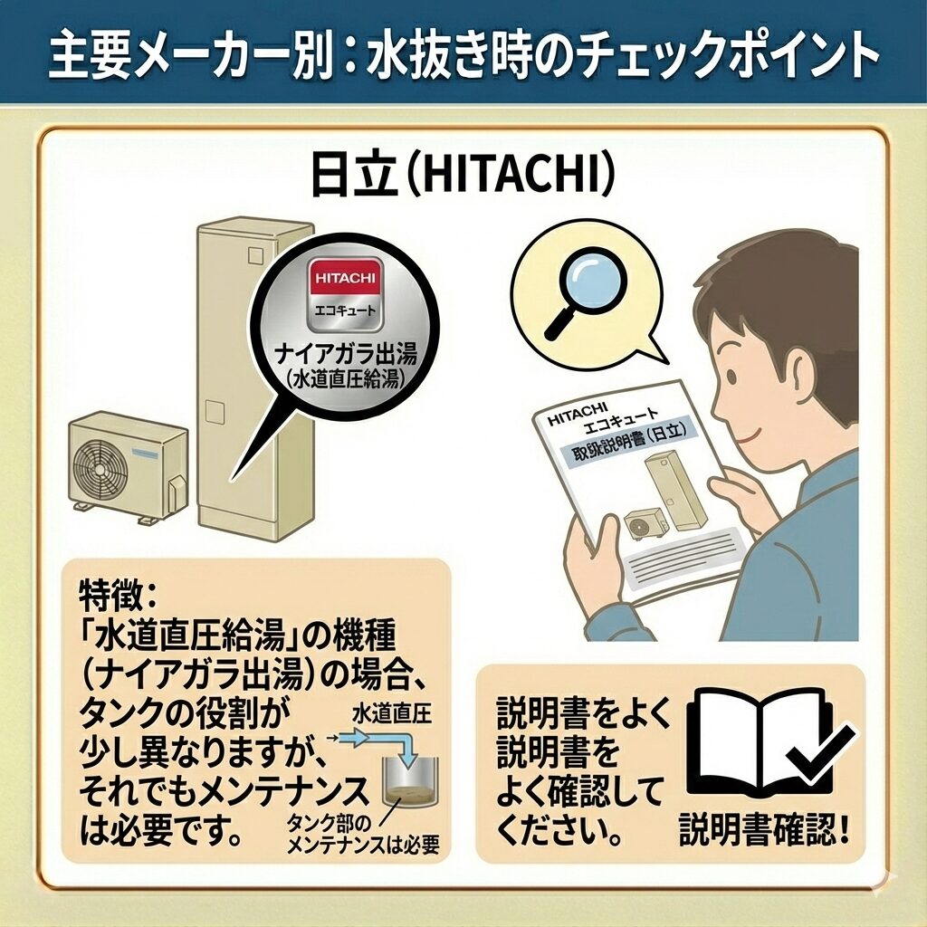 - 特徴: 「水道直圧給湯」の機種(ナイアガラ出湯)の場合、タンクの役割が少し異なりますが、それでもメンテナンスは必要です。説明書をよく確認してください。