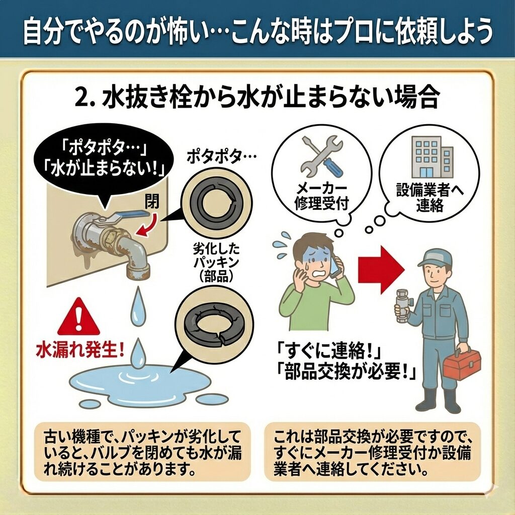 古い機種で、パッキンが劣化していると、バルブを閉めてもポタポタと水が漏れ続けることがあります。これは部品交換が必要ですので、すぐにメーカー修理受付か設備業者へ連絡してください。