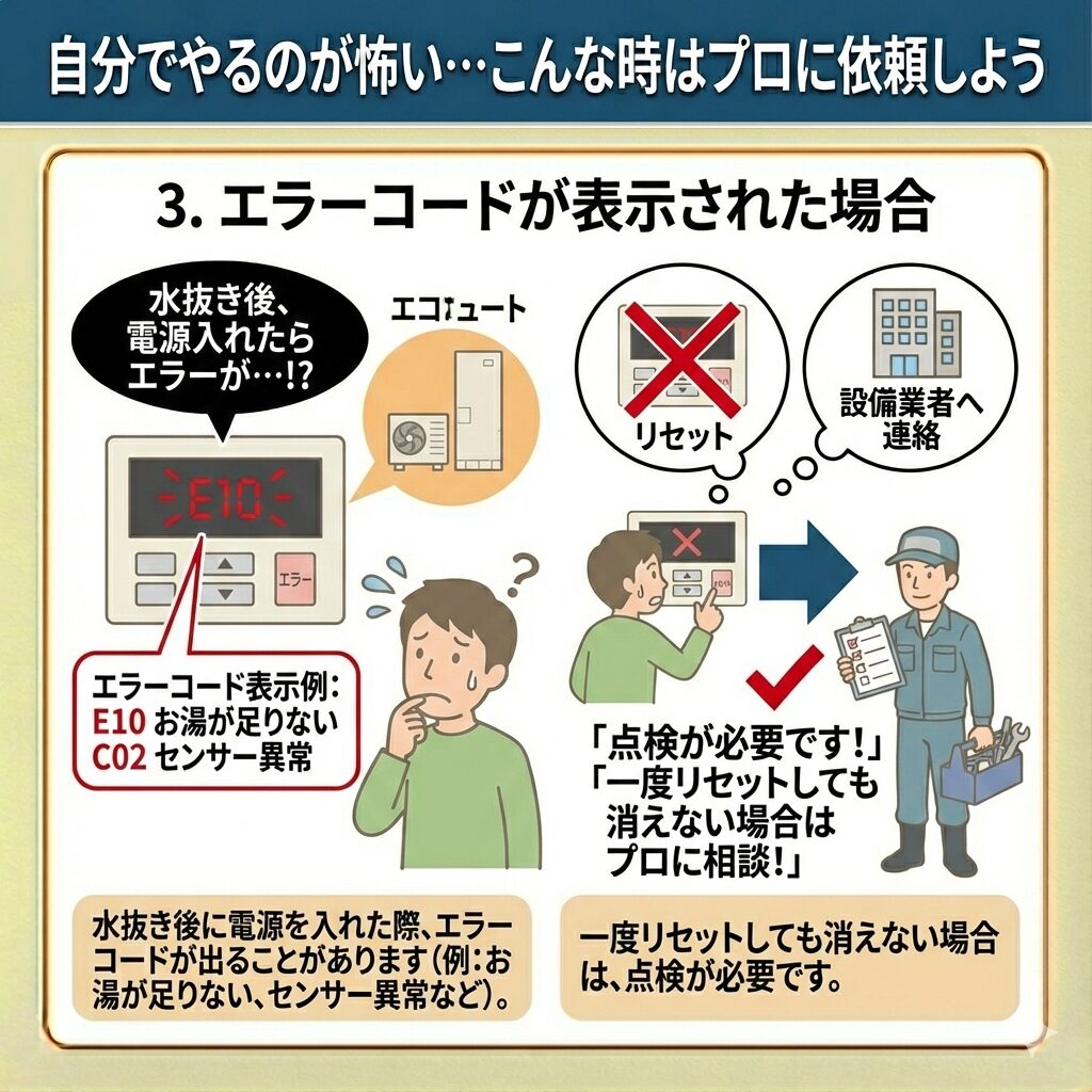 水抜き後に電源を入れた際、エラーコードが出ることがあります(例:お湯が足りない、センサー異常など)。一度リセットしても消えない場合は、点検が必要です。
