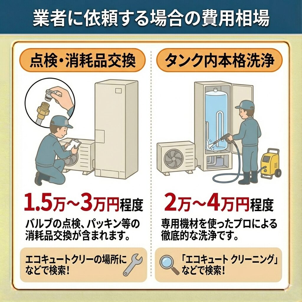 - タンク内本格洗浄: 2万〜4万円程度 ※「エコキュート クリーニング」などで検索すると、専門業者が見つかります。