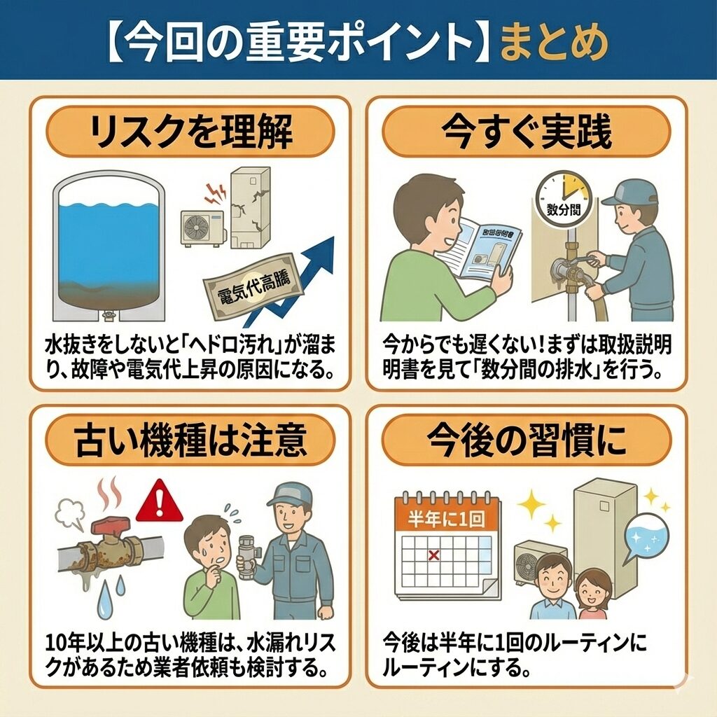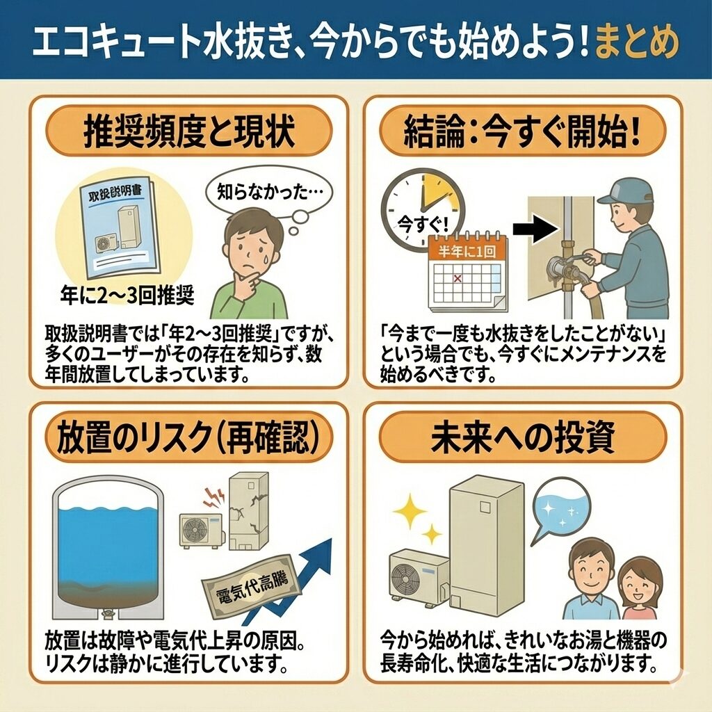 エコキュートの水抜きを一度もしたことがないからといって、過度に恐れる必要はありません。しかし、これ以上放置すれば、故障や衛生面でのリスクは確実に高まります。