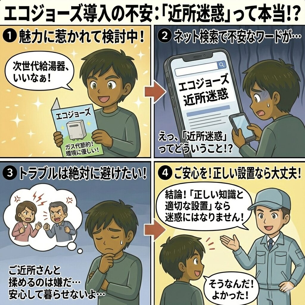 エコジョーズは、ガス代を節約し、地球環境にも優しい、素晴らしい給湯器です。 「近所迷惑」と言われる原因のほとんどは、製品そのものではなく、「設置場所」と「工事の質」にあります。
