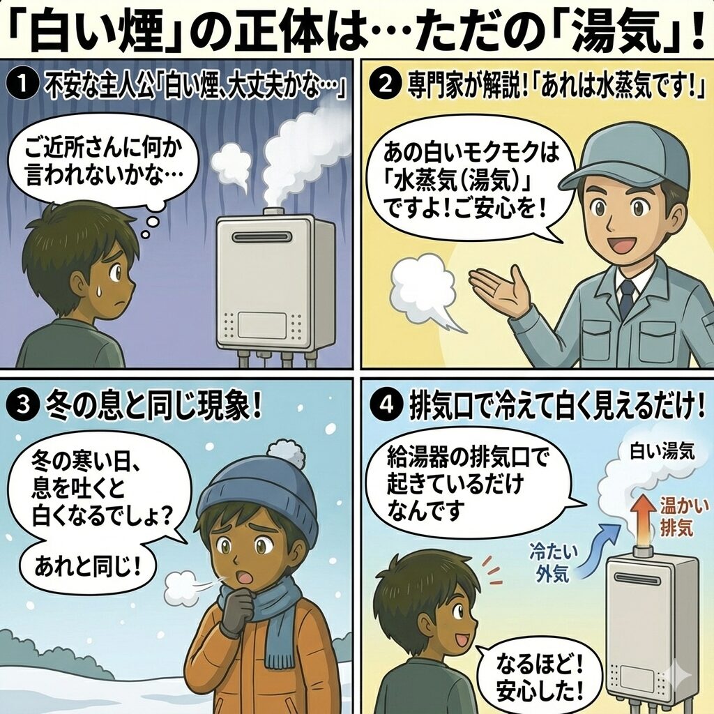 「お宅の給湯器から、ものすごい白い煙が出ている!火事じゃないか!」 「毎日白い煙がこっちの窓に向かってきて、気味が悪い!」こんな苦情が、特に冬の寒い日の朝に寄せられることがあります。言われた方はびっくりしますよね。