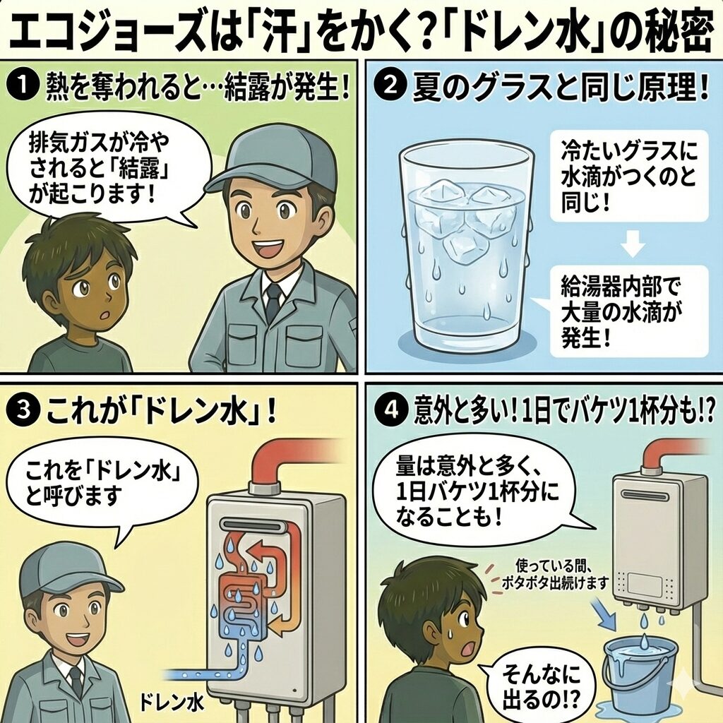 夏場、冷たい氷水の入ったグラスの表面に水滴がつきますよね? あれと同じ原理です。給湯器の内部で、大量の水滴が発生するのです。これを「ドレン水」と呼びます。