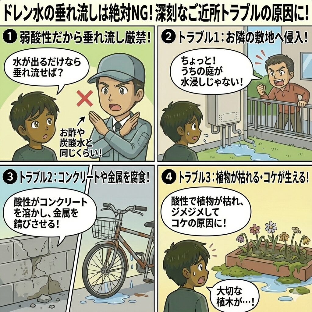 「白い湯気」は誤解を解けば解決しますが、実はもっと物理的に迷惑をかけてしまう可能性があるのが「排水(ドレン水)」の問題です。
