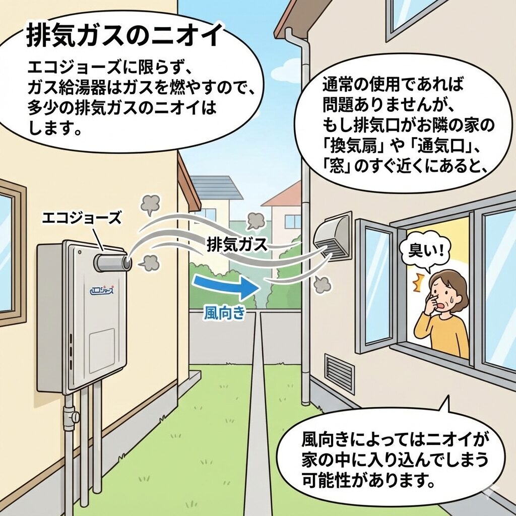 エコジョーズに限らず、ガス給湯器はガスを燃やすので、多少の排気ガスのニオイはします。
