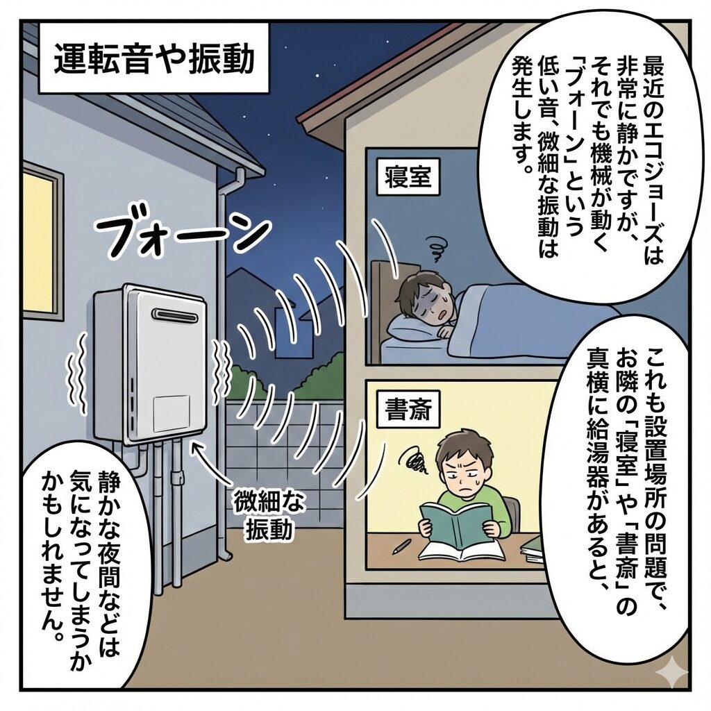 最近のエコジョーズは非常に静かですが、それでも機械が動く「ブォーン」という低い音や、微細な振動は発生します。