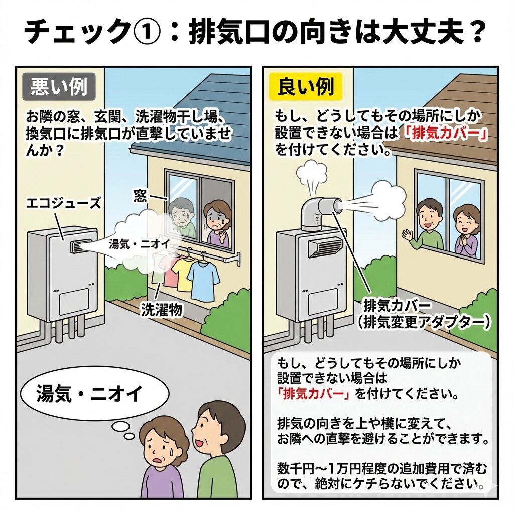 これが最も重要です。「湯気」や「ニオイ」が、お隣さんの迷惑にならない方向へ向くように設置計画を立てましょう。