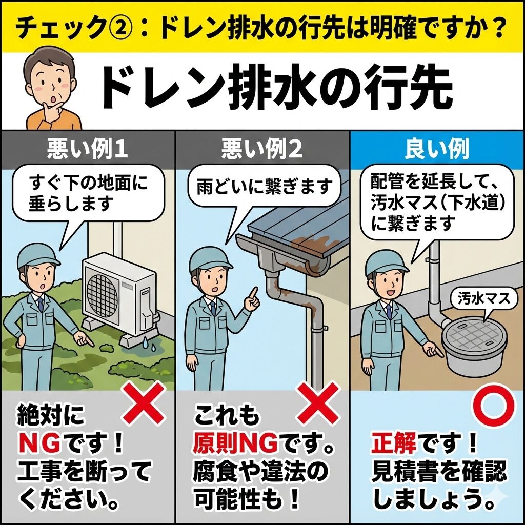 - 「ドレン排水」は必ず下水道へ繋ぐ。垂れ流しは絶対にダメ。
