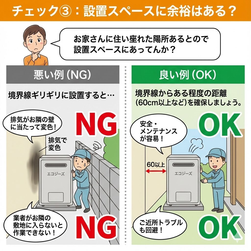給湯器の周りには、安全のため、あるいはメンテナンスのために一定のスペースが必要です。 お隣との境界線ギリギリに設置すると、排気がお隣の壁に当たって変色させたり、メンテナンス業者がお隣の敷地に入らないと作業できなかったりします。