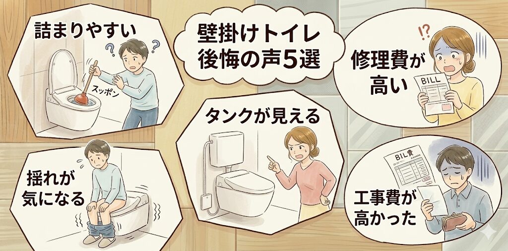 実際に壁掛けトイレを導入した方から寄せられる後悔の声は、「詰まりやすい」「修理費が高い」「タンクが見える」「揺れが気になる」「工事費が高かった」の5つに集約されます。