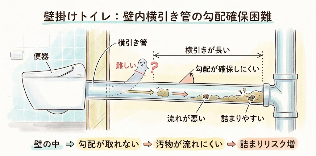 排水管が壁の中を通るため勾配が確保しにくい