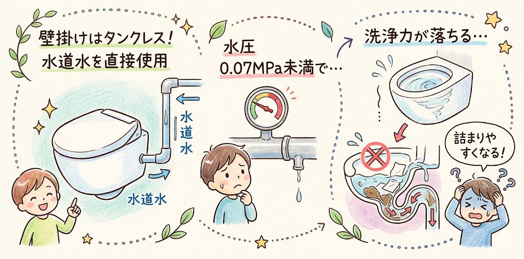 水圧が0.07MPa未満の環境では洗浄力が落ち、詰まりが起きやすくなります。