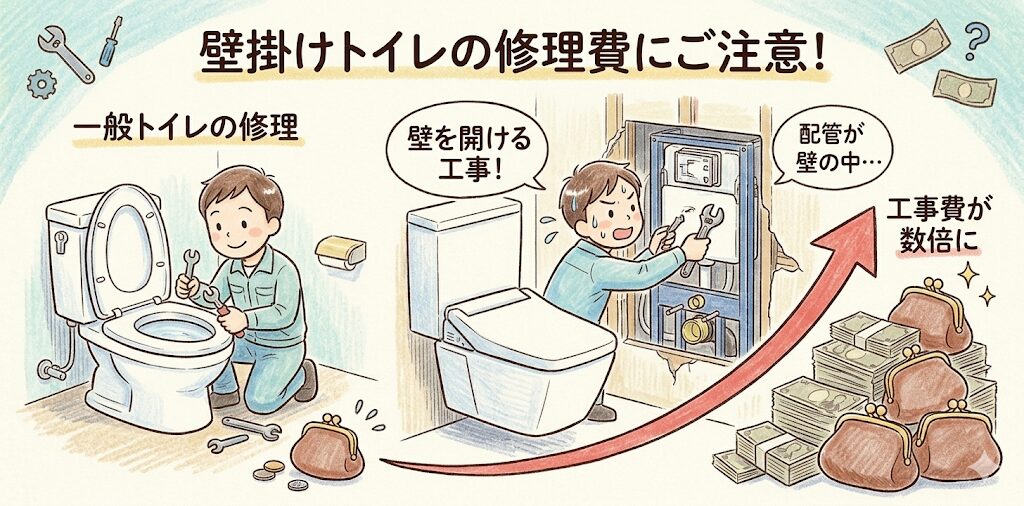 壁掛けトイレが故障した場合、排水管や内部の部品が壁の中に収まっているため、修理の際に壁を開口する工事が必要になることがあります。