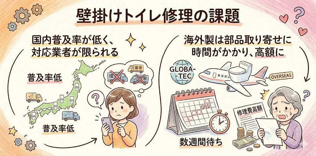 壁掛けトイレは国内での普及率がまだ低いため、対応できる修理業者が限られる場合があります。