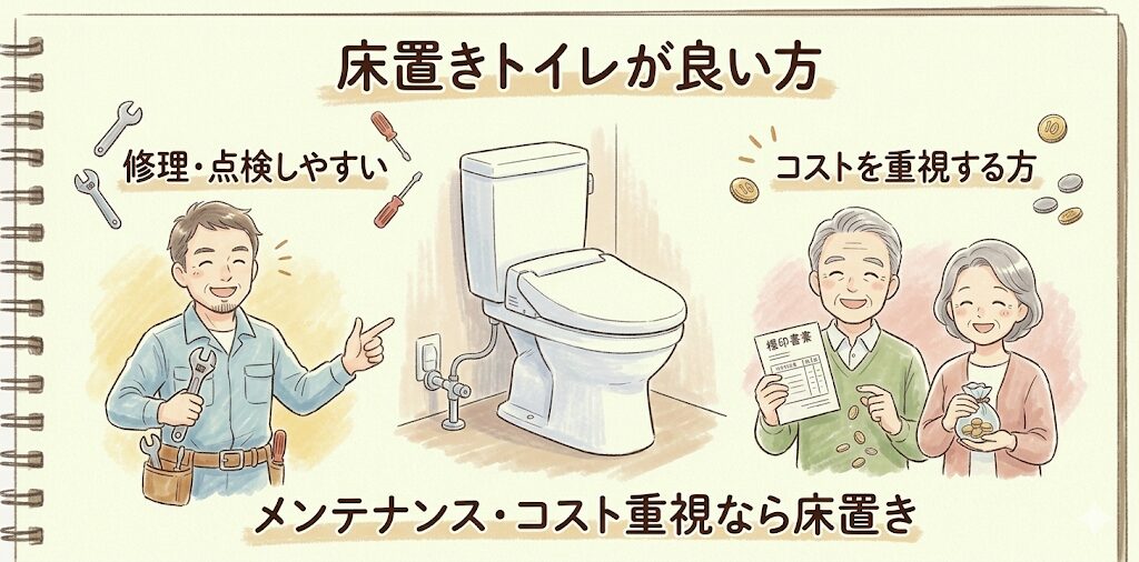 修理・メンテナンスのしやすさやコストを重視する方には床置きトイレの方が向いています。