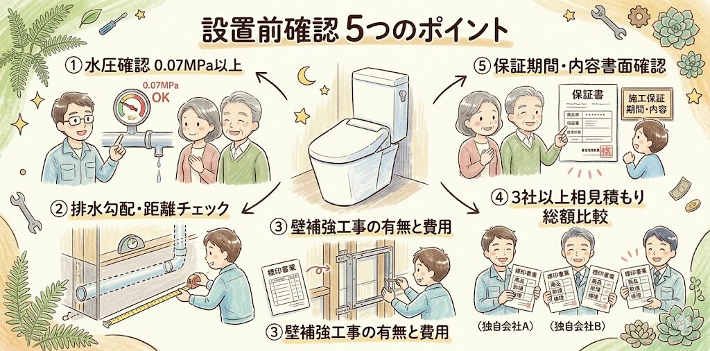 後悔しないために、水圧の事前確認・排水管の勾配設計・工事費込みの総額での相見積もり・保証内容の書面確認を必ず行ってください。
