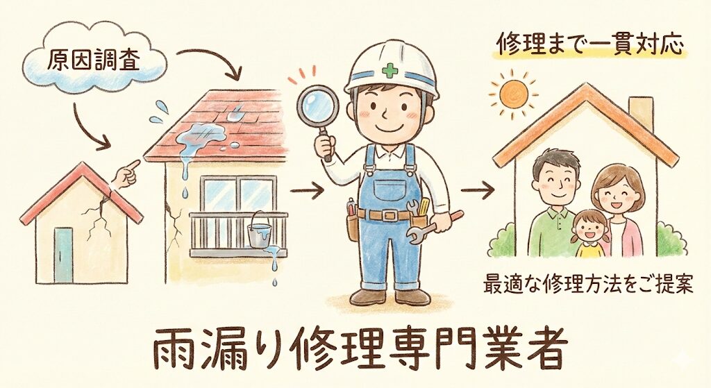 雨漏り修理をどこに頼むかは、建物の状況、雨漏りの原因、緊急性、予算によって変わります。新築10年以内であればまず建築業者に、それ以外の場合は雨漏り修理専門業者や屋根工事専門業者に依頼するのが基本です。