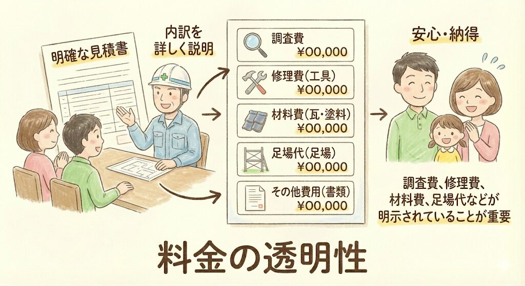 見積もりが明確で、内訳を詳しく説明してくれる業者を選びましょう。調査費、修理費、材料費、足場代などが明示されていることが重要です。