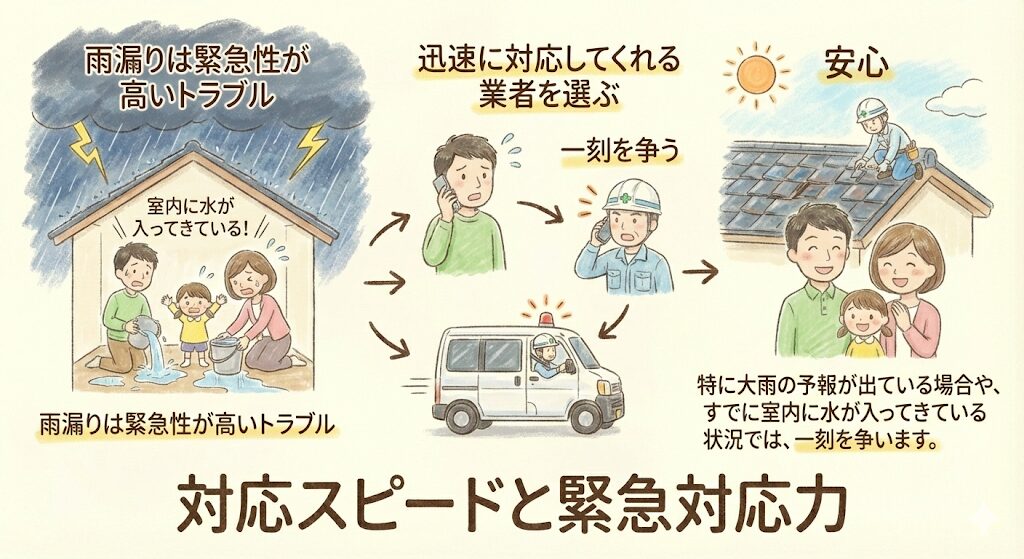雨漏りは緊急性が高いトラブルです。迅速に対応してくれる業者を選ぶことが重要です。特に大雨の予報が出ている場合や、すでに室内に水が入ってきている状況では、一刻を争います。