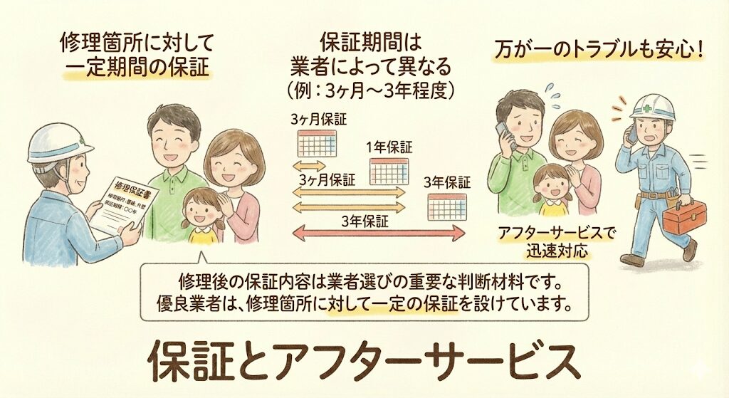 修理後の保証内容は業者選びの重要な判断材料です。優良業者は、修理箇所に対して一定期間の保証を設けています。保証期間は3ヶ月から3年程度まで業者によって異なります。