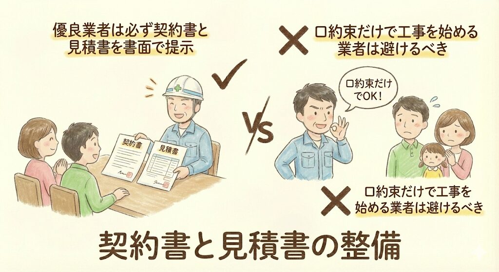 優良業者は必ず契約書と見積書を書面で提示します。口約束だけで工事を始める業者は避けるべきです。