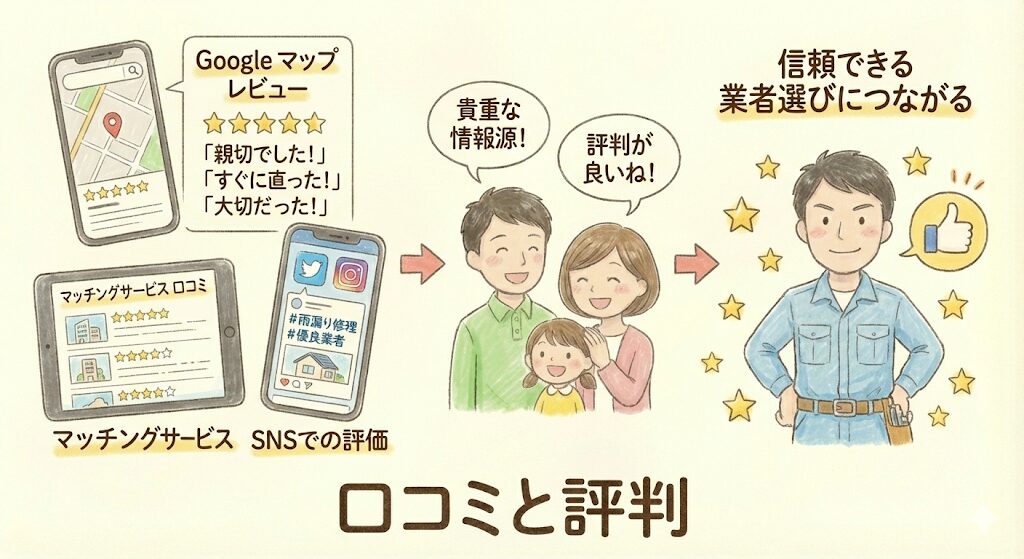 実際に利用した人の口コミや評判は、業者選びの貴重な情報源です。Google マップのレビュー、マッチングサービスの口コミ、SNSでの評価などを確認しましょう。