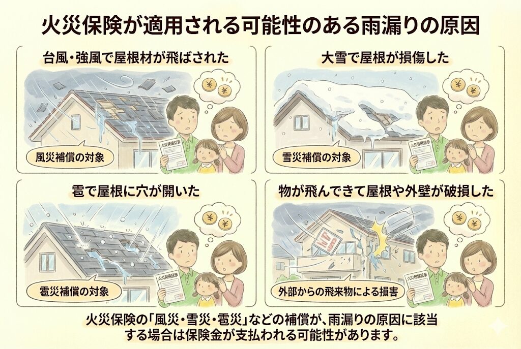 火災保険の「風災・雪災・雹災」などの補償が、雨漏りの原因に該当する場合は保険金が支払われる可能性があります。