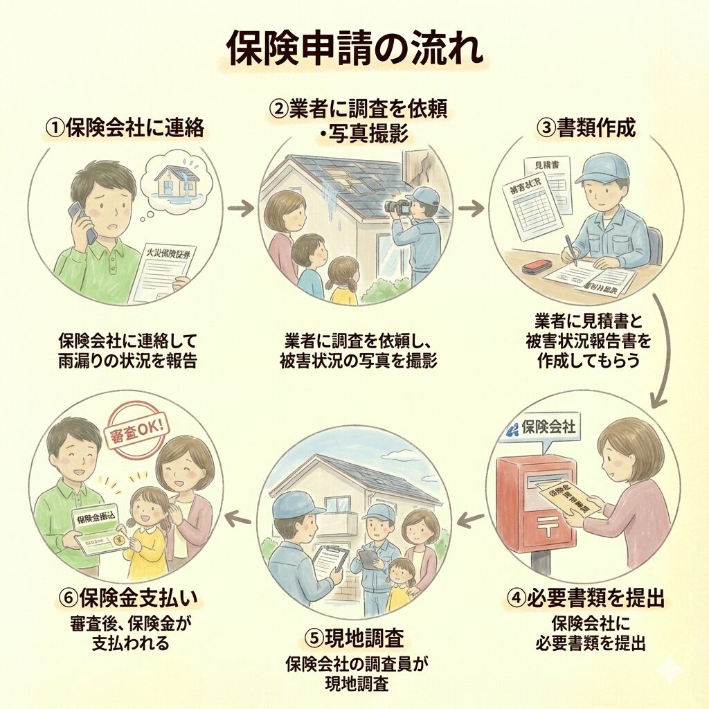 - 保険会社に連絡して雨漏りの状況を報告