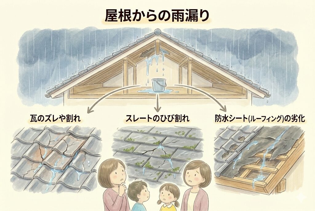 最も多い雨漏りの原因です。瓦のズレや割れ、スレートのひび割れ、防水シート(ルーフィング)の劣化などが主な原因です。