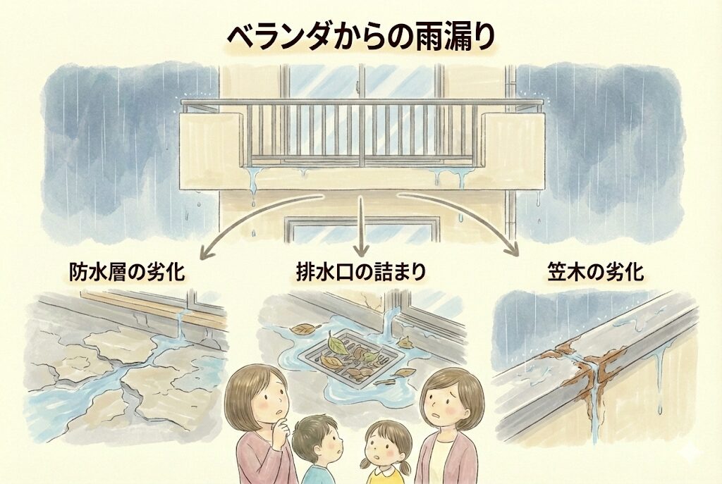 ベランダ下の部屋の天井にシミができる、壁にカビが生えるといった症状が現れます。ベランダの防水層は10〜15年程度で劣化するため、定期的なメンテナンスが重要です。