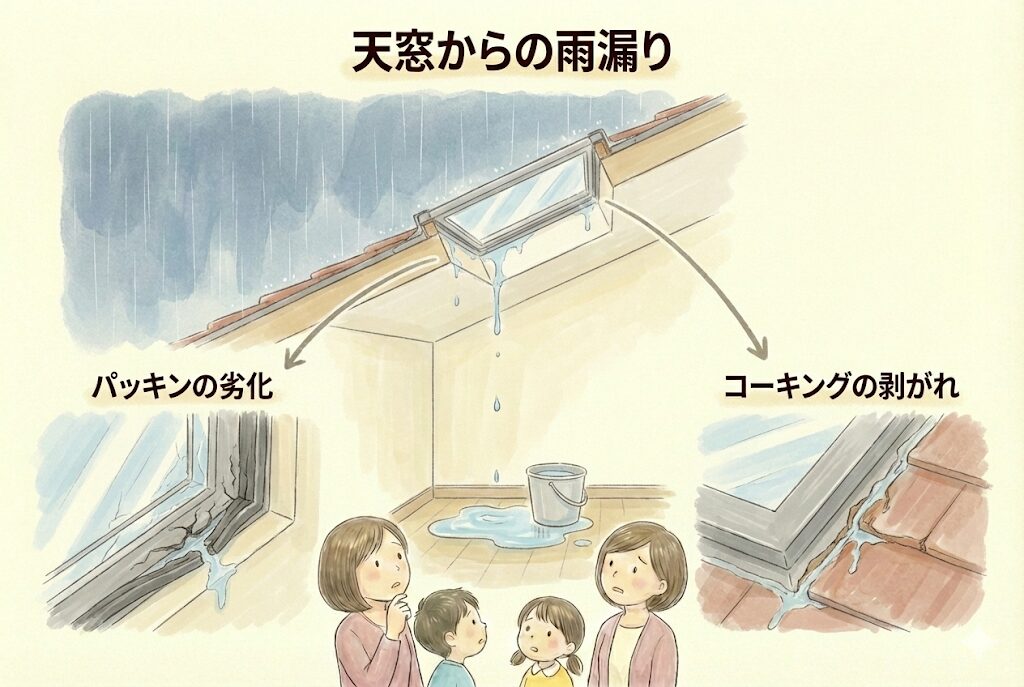 天窓周りのパッキンの劣化、コーキングの剥がれなどが原因です。