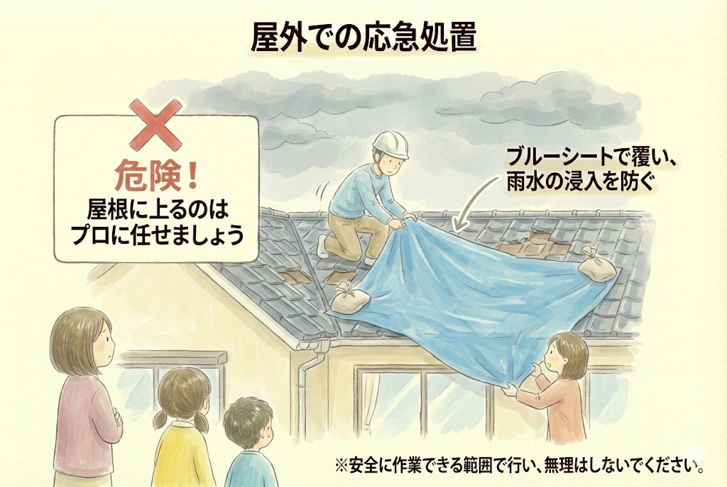 屋根に上るのは危険ですが、安全に作業できる範囲であれば、ブルーシートで覆うことで一時的に雨水の浸入を防げます。