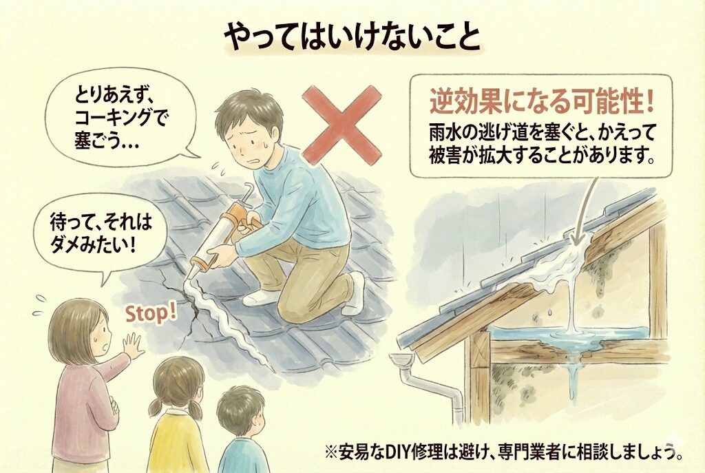 応急処置として屋根にコーキング材を塗る人がいますが、これは逆効果になる可能性があります。雨水の逃げ道を塞いでしまうと、かえって被害が拡大することがあります。